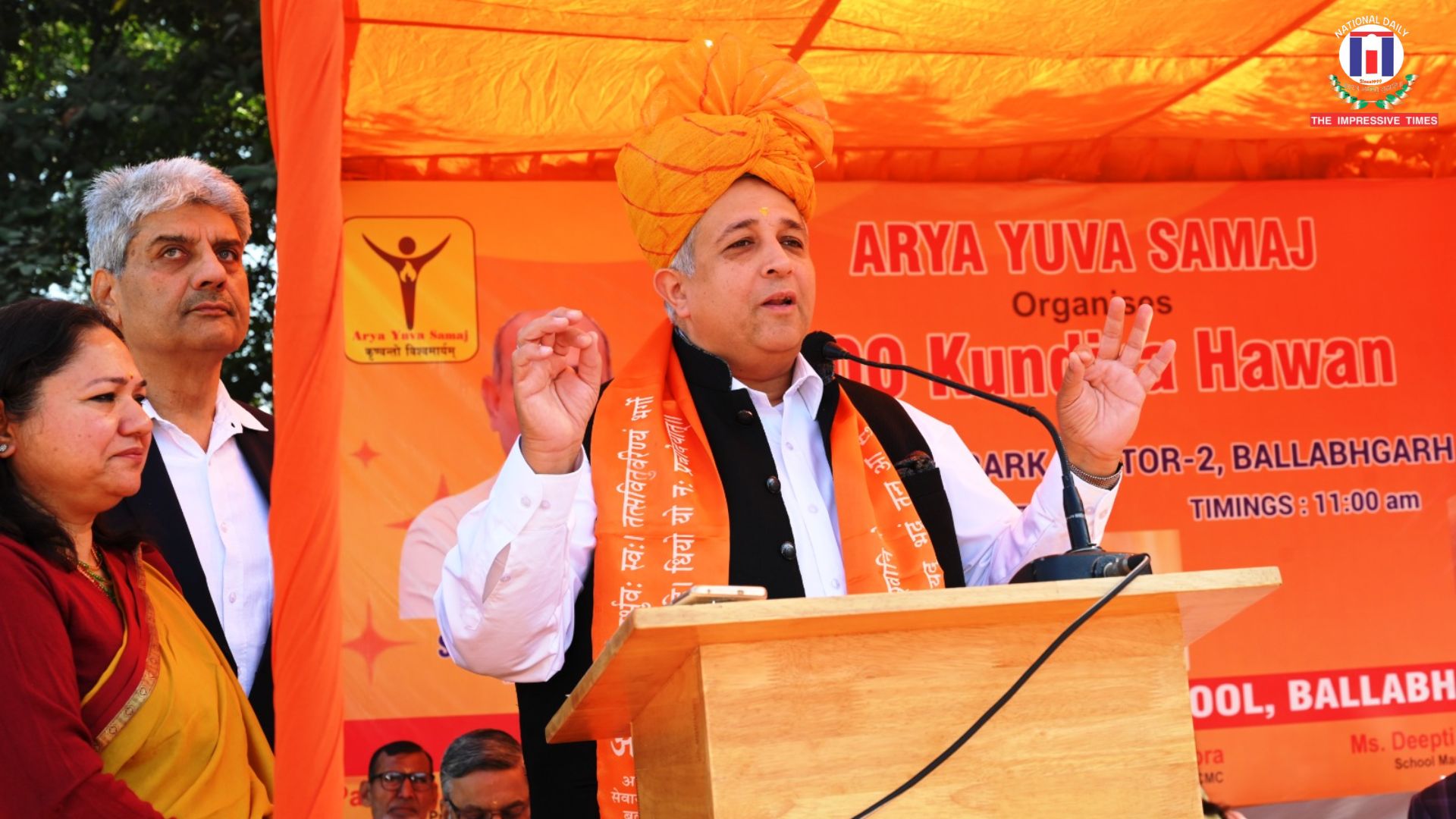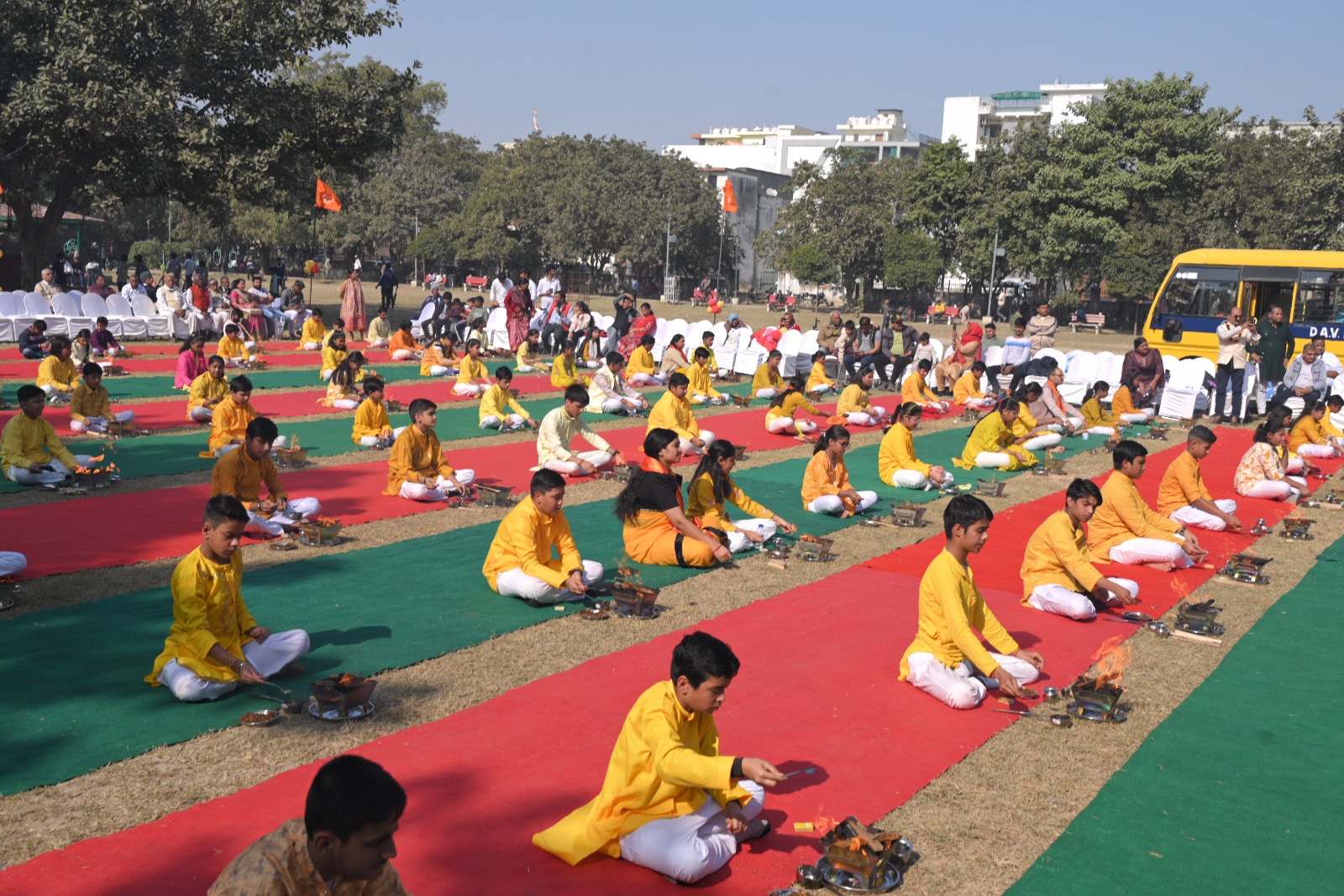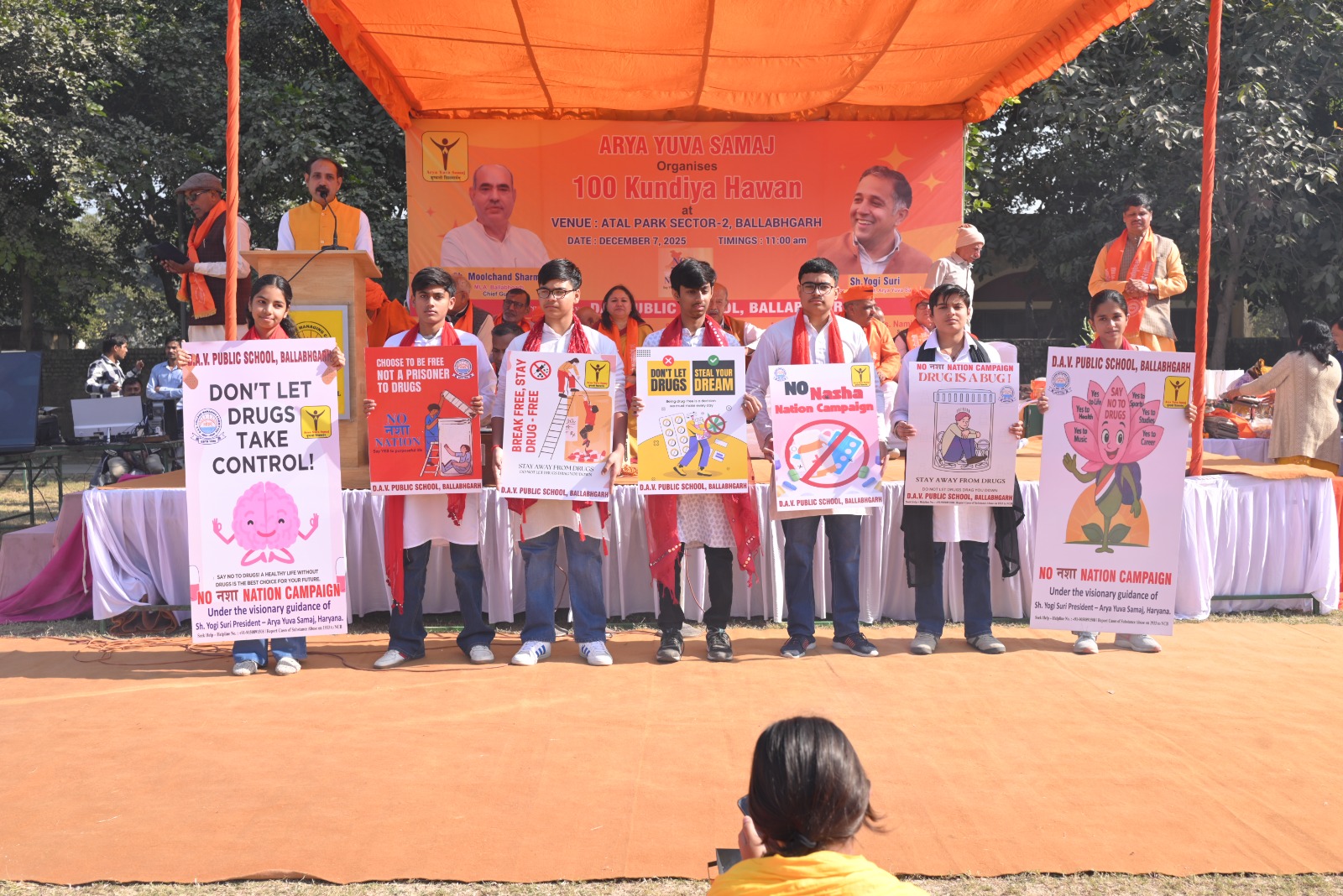Faridabad : DAV Public School, Ballabgarh, in collaboration with Arya Yuva Samaj, organized a large-scale 100-Kundiya Yajna and public awareness program at Atal Park, Sector-2, Ballabgarh under the “No Nasha Nation” campaign inspired by Padma Dr. Punam Suri, President, DAV Managing Committee and Arya Pradeshik Pratinidhi Sabha , New Delhi.