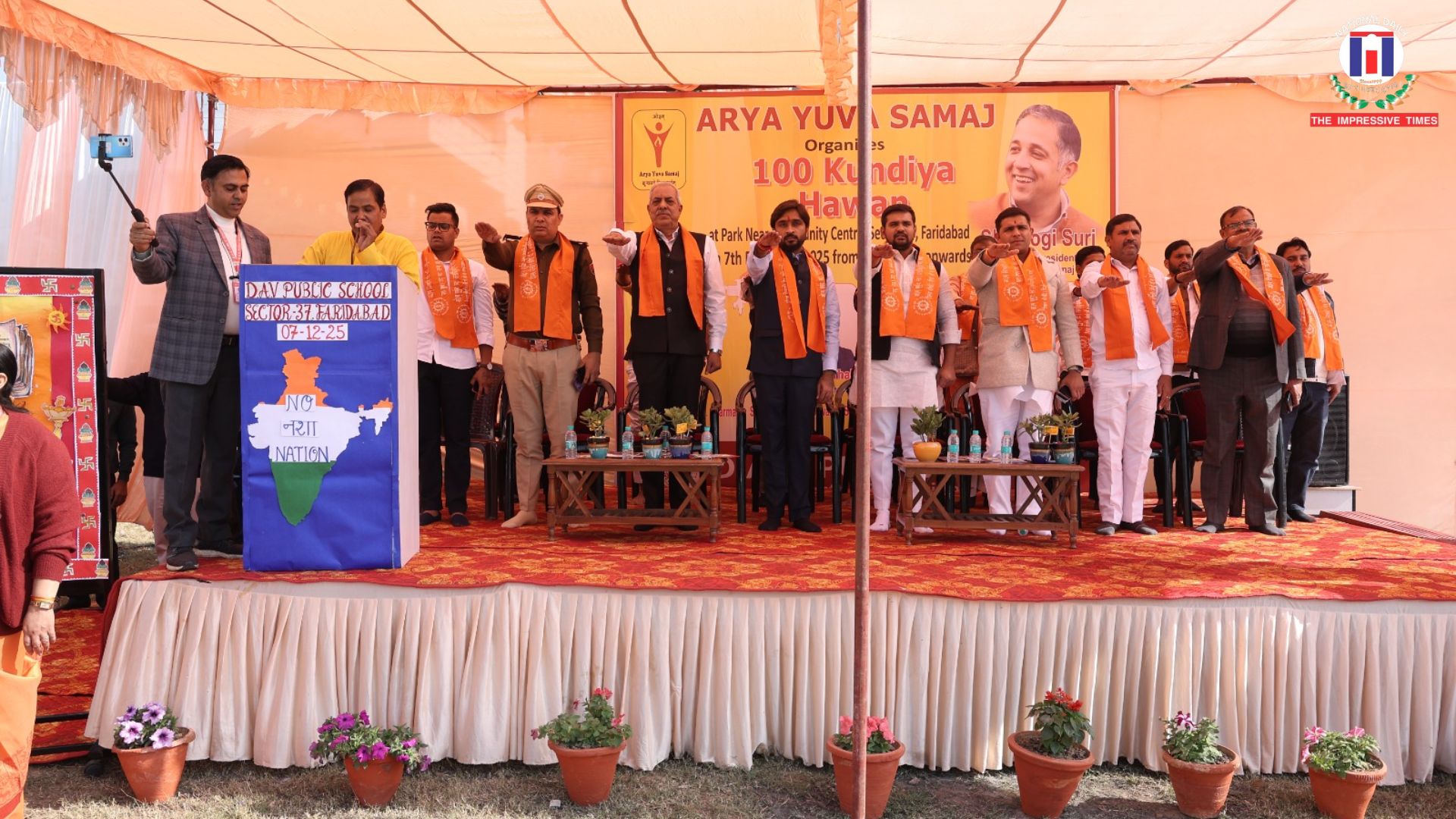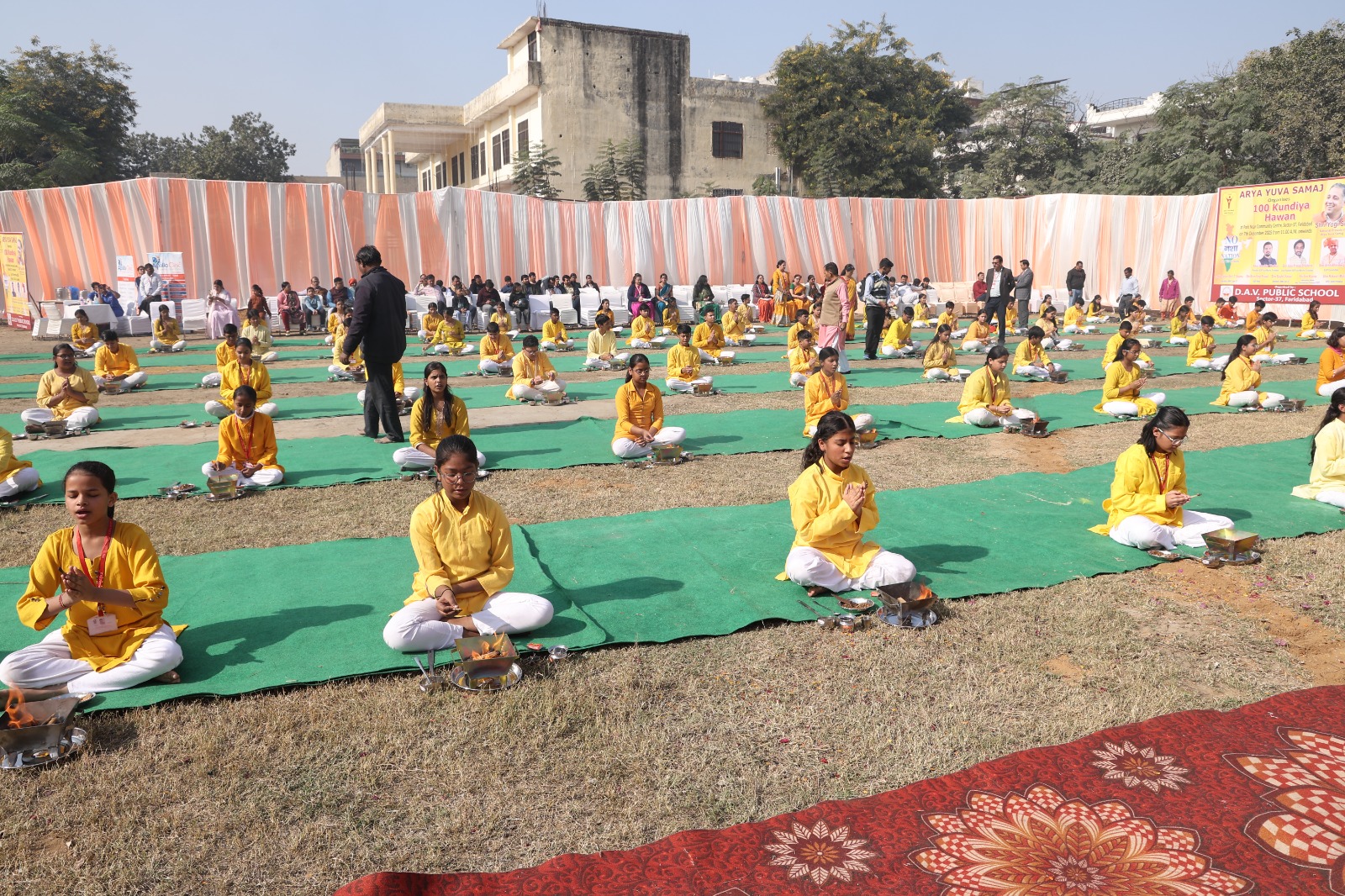 Faridabad :With the blessing and guidance of Arya Rattan Punam Suri Ji – Padma , President, DAV College Managing Committee, and the dynamic leadership of Yogi Suri Ji, National President, Arya Yuva Samaj, a nationwide mission has been initiated by DAVCMC in collaboration with Arya Yuva Samaj through the ‘No नशा Nation Campaign’ to build a drug-free India. Strengthening this noble endeavour, D.A.V. Public School, Sector-37, Faridabad, under the able guidance of the School Principal, Ms Deepti Jagota, organised a grand 100-Kundiya Hawan-Yajna on December 7, 2025.