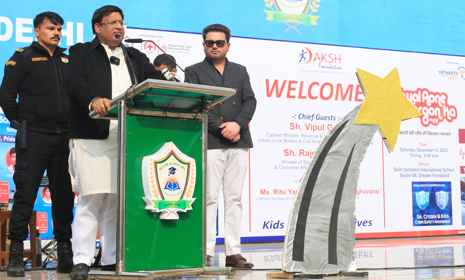 Five creative, value-based competitions involving children and elders highlighted emotional bonding and intergenerational harmony. Vipul Goel, Revenue Minister, Government of Haryana, and Rajesh Nagar, Minister of State, Government of Haryana, were the Chief Guests, while International poet Dinesh Raghuvanshi and T.S. Dalal, Chairman, Delhi Scholars International School, attended as Special Guests.