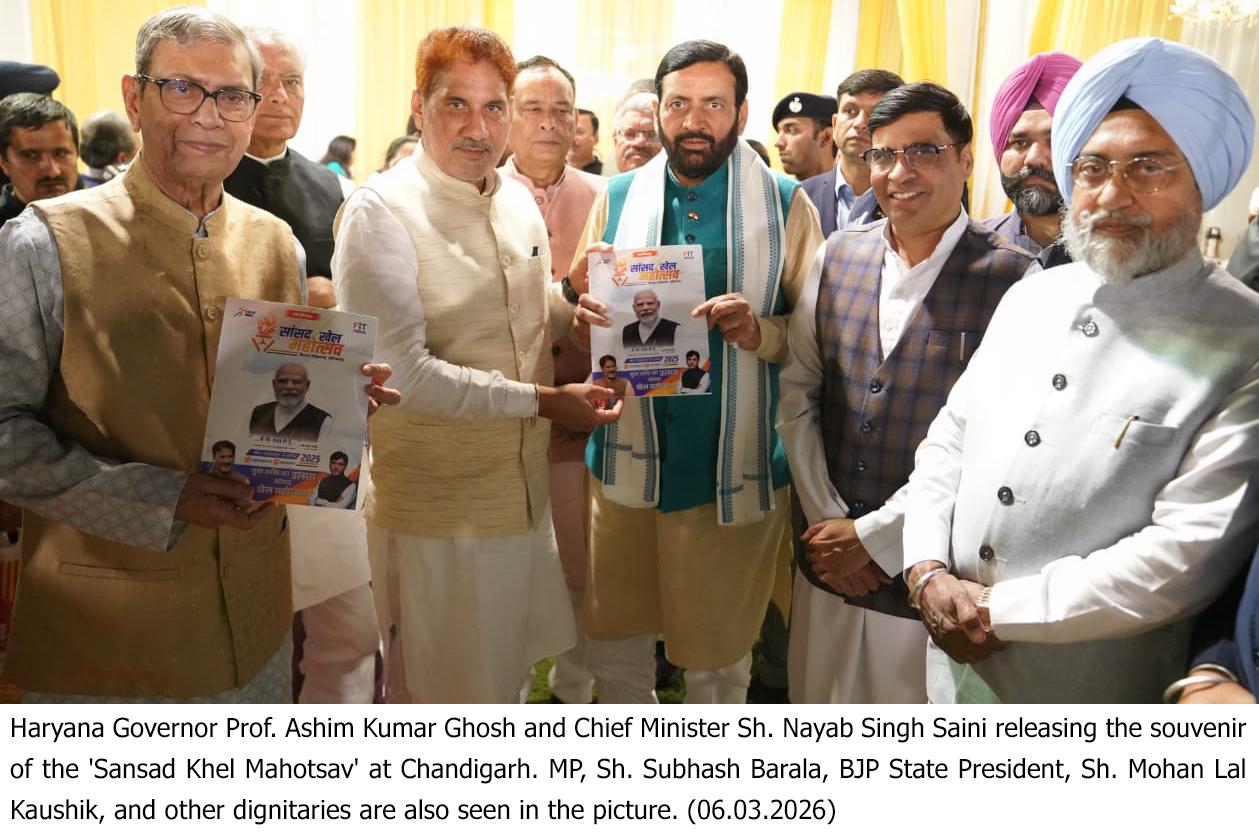 New Delhi , March 6— Haryana Governor, Prof. Ashim Kumar Ghosh and Chief Minister Sh. Nayab Singh Saini on Thursday jointly released a souvenir of Sansad Khel Mahotsav to be held in the Sirsa Parliamentary Constituency.