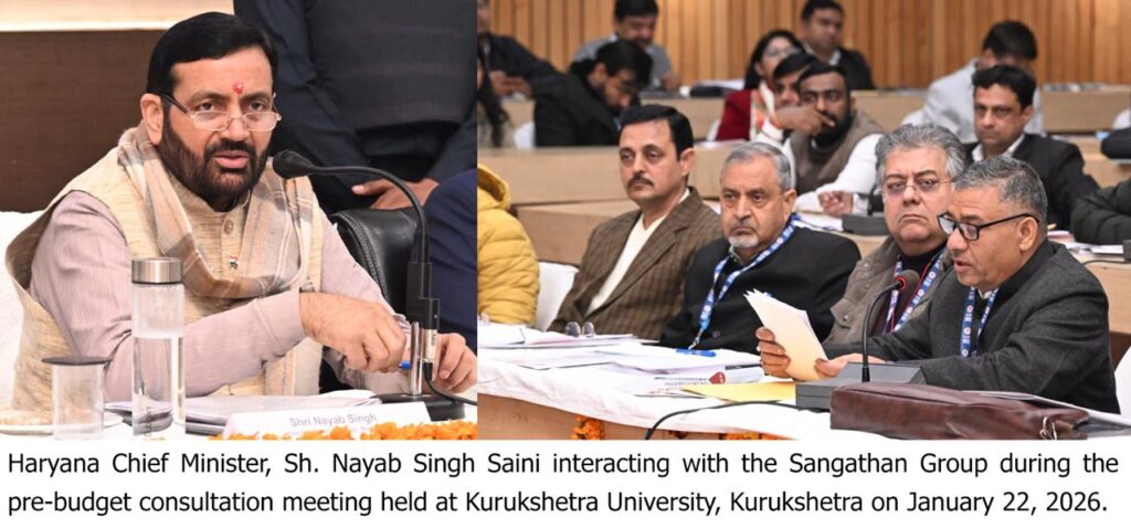 New Delhi, January 22: Haryana Chief Minister Nayab Singh Saini on Wednesday said that the upcoming State Budget will be shaped through active public participation, ensuring inclusive and balanced development across Haryana. He was addressing a pre-budget consultation meeting held in Kurukshetra, attended by representatives of various social, educational, labour, farmer and cultural organisations.