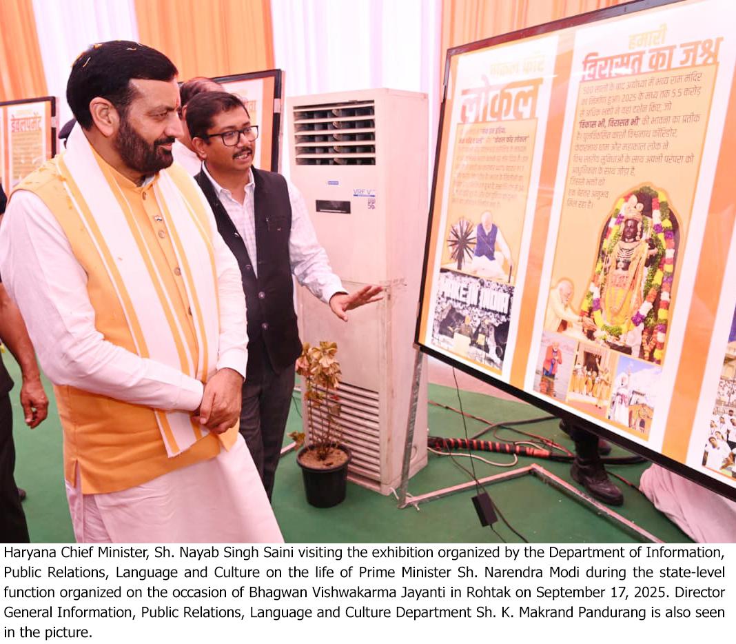 Chief Minister Nayab Singh Saini also visited an exhibition on the life of Prime Minister Narendra Modi, organized by the Department of Information, Public Relations, and Languages, at the Vishwakarma Jayanti celebration site. The exhibition highlighted the Prime Minister’s public service initiatives and his efficient work ethic. K. Makarand Pandurang, Director General of the Department, provided detailed information about the exhibition to the Chief Minister.