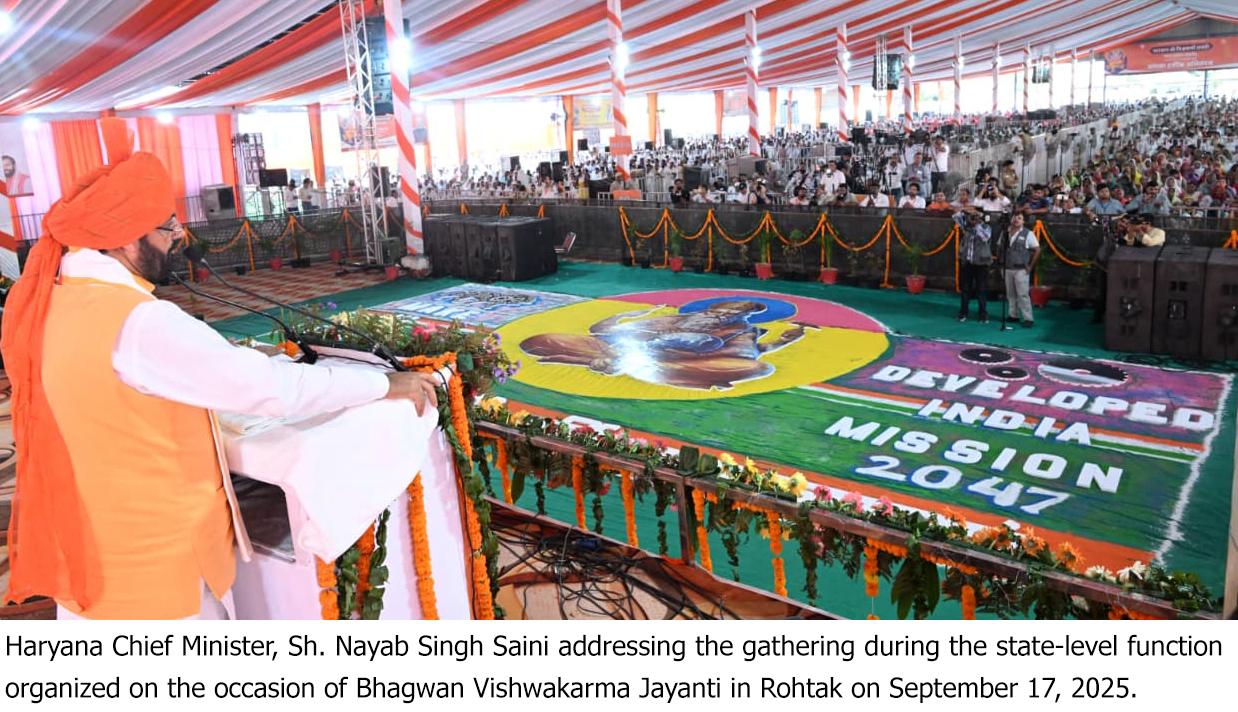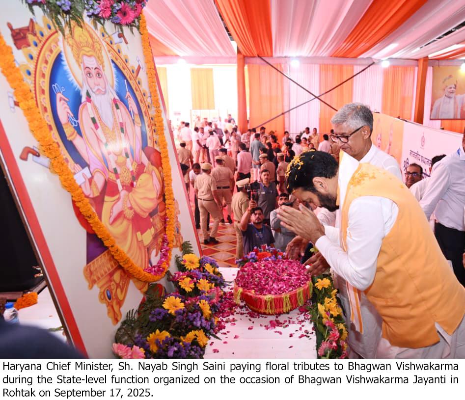 Nayab Singh Saini said it was a fortunate coincidence that the day marks both the birth anniversary of Lord Vishwakarma, the divine craftsman, and the birthday of Prime Minister Narendra Modi, whom he described as the architect of a “New India” in the 21st century. He paid homage to Lord Vishwakarma on behalf of the 2.75 crore people of Haryana and extended warm birthday greetings and best wishes to the Prime Minister.