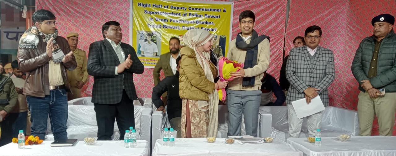 Rewari: Following the directions of Haryana CM Nayab Singh Saini, the district administration under the chairmanship of DC Abhishek Meena organized a Night Stay Public Interaction Program on Tuesday in village Bambad of Rewari district. DC, along with SP Hemendra Meena, SDM Suresh Kumar, and other departmental officers, interacted directly with villagers, listened to public grievances, and provided on-the-spot relief in several cases. Villagers also shared suggestions related to village development. The DC and SP were accorded a warm welcome by the Sarpanch and residents on arrival. DC Meena said that the Samadhan Shivirs and Night Stay Programs initiated by CM are benefiting people from all sections. Officers are reaching citizens at their homes to ensure timely resolution of problems.