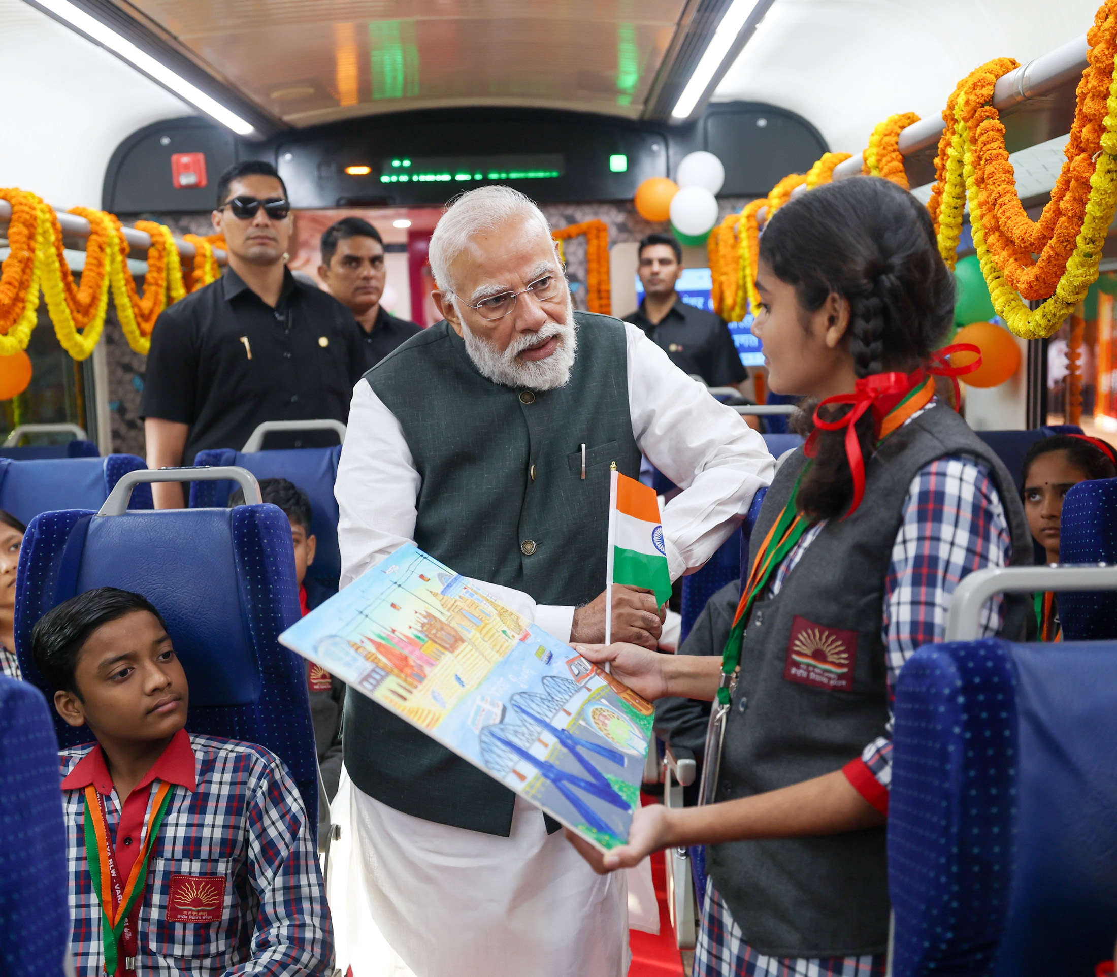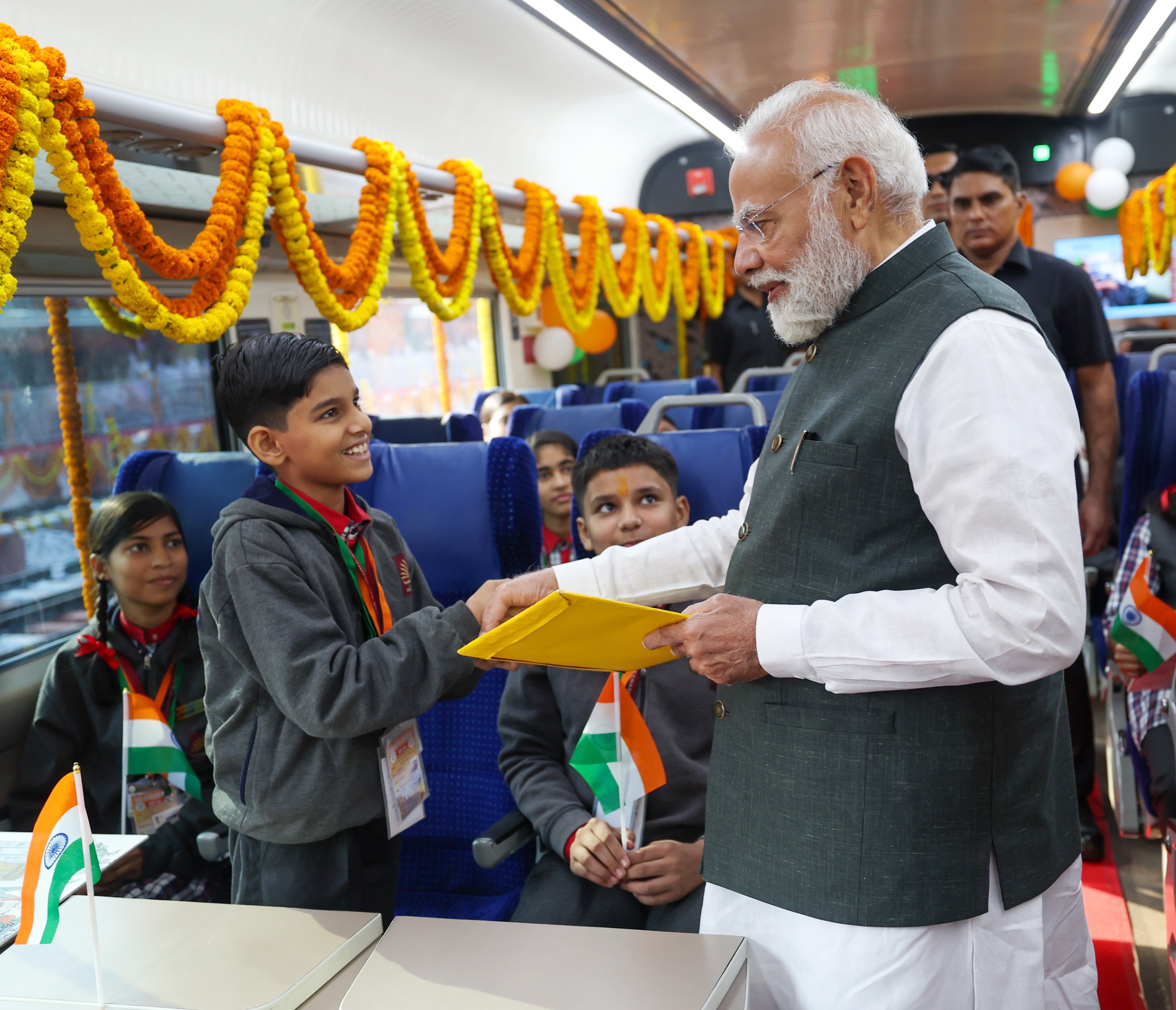 PM interacting with students on board Vande Bharat Express train at Varanasi, in Uttar Pradesh on November 08, 2025.