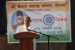 NEW DELHI : On the occasion of India’s 77th Republic Day, on Monday, January 26, 2026, Dattatreya Hosabale, General Secretary of the Rashtriya Swayamsevak Sangh (RSS), hoisted the National Flag at Keshav Kunj in Delhi and addressed the gathering. Extending his best wishes to the countrymen on Republic Day, Dattatreya Hosabale said that today we should pledge to uphold India’s eternal spiritual values, civic duties, and our national duty in our lives. Protecting our Constitution, safeguarding India’s unity and integrity, and securing India’s borders are our paramount national duties.