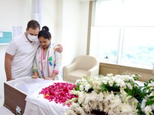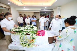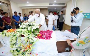 Both leaders stood in solemn silence beside the mortal remains of Shibu Soren, offering floral tributes and joining the family in mourning. Several Congress workers and supporters had gathered outside the hospital premises, many with placards reading “Salute to Dishom Guru” and “Jharkhand’s Father Figure.”