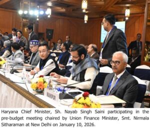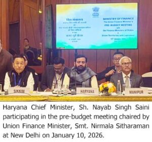 New Delhi, January 10 – A pre-Budget meeting was held today in New Delhi under the chairpersonship of Union Finance Minister  Nirmala Sitharaman, with the Finance Ministers of all States and Union Territories (including members of the legislative bodies). Haryana Chief Minister  Nayab Singh Saini participated in the meeting and placed several important demands related to Haryana for inclusion in the Union Budget. These included budgetary allocations and other key demands concerning agriculture, rural development, medical education, industries, and allied sectors. He said that the Union Budget would further pave the way for Haryana’s progress and that Haryana would make its full contribution toward making India a developed nation by 2047.