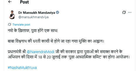 New Delhi, July 14, 2025 — Union Minister of Youth Affairs & Sports and Labour & Employment, Dr. Mansukh Mandaviya, today announced the ‘Youth Spiritual Summit’ to be held in Varanasi from July 18 to 20, 2025, under the theme ‘Nasha Mukt Yuva for Viksit Bharat’. The summit aims to ignite the spiritual strength and leadership of Indian youth in building a drug-free society.