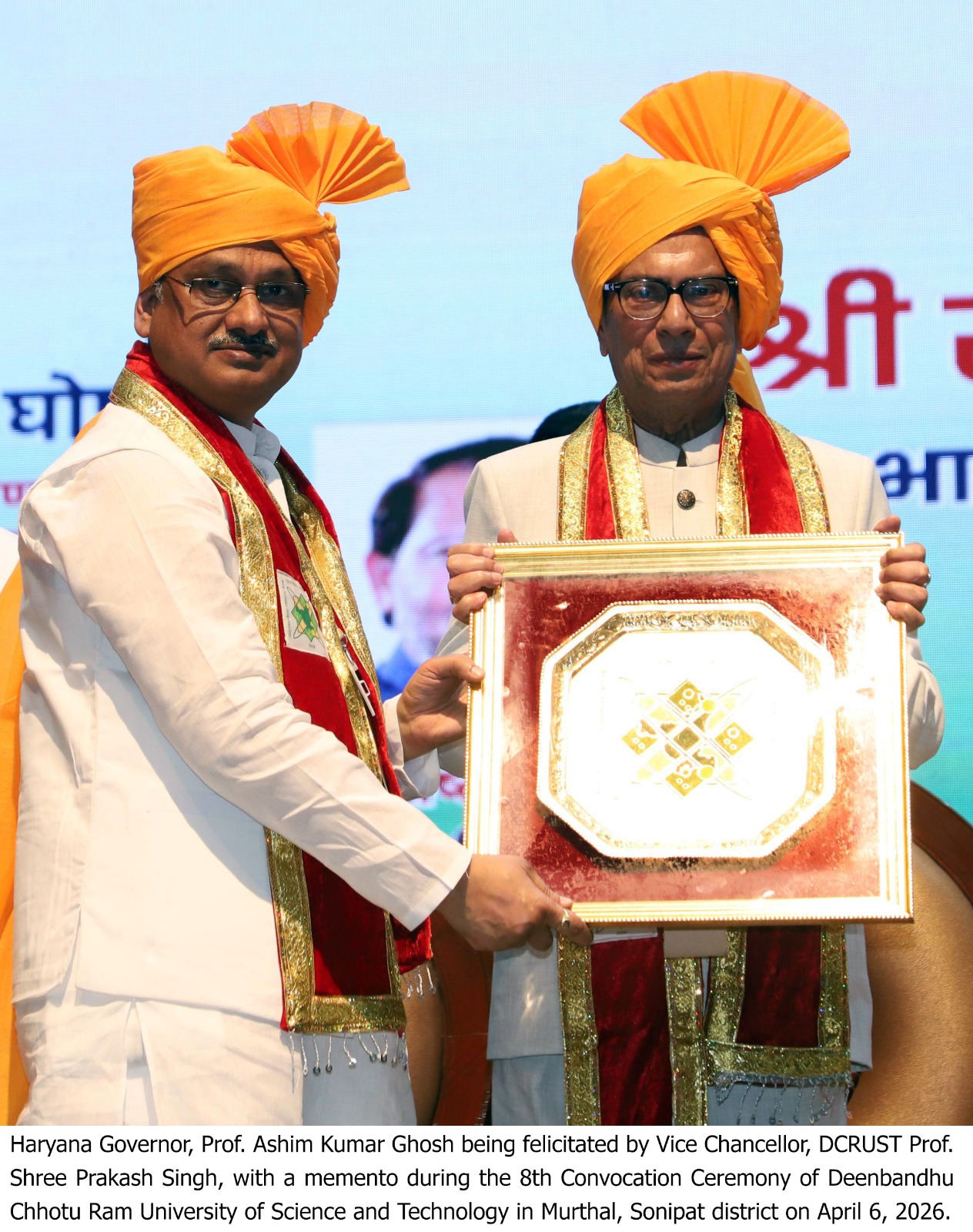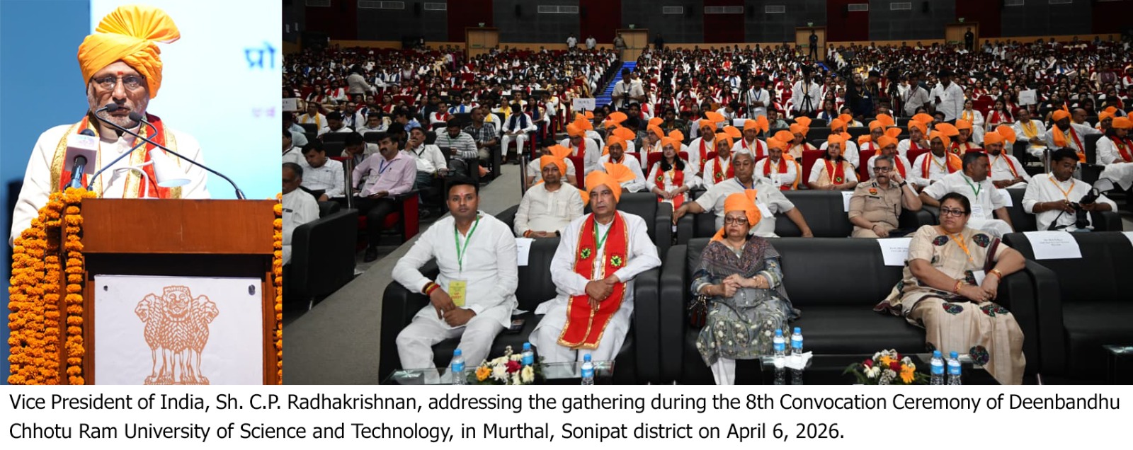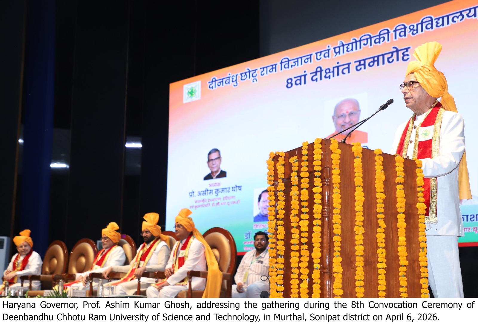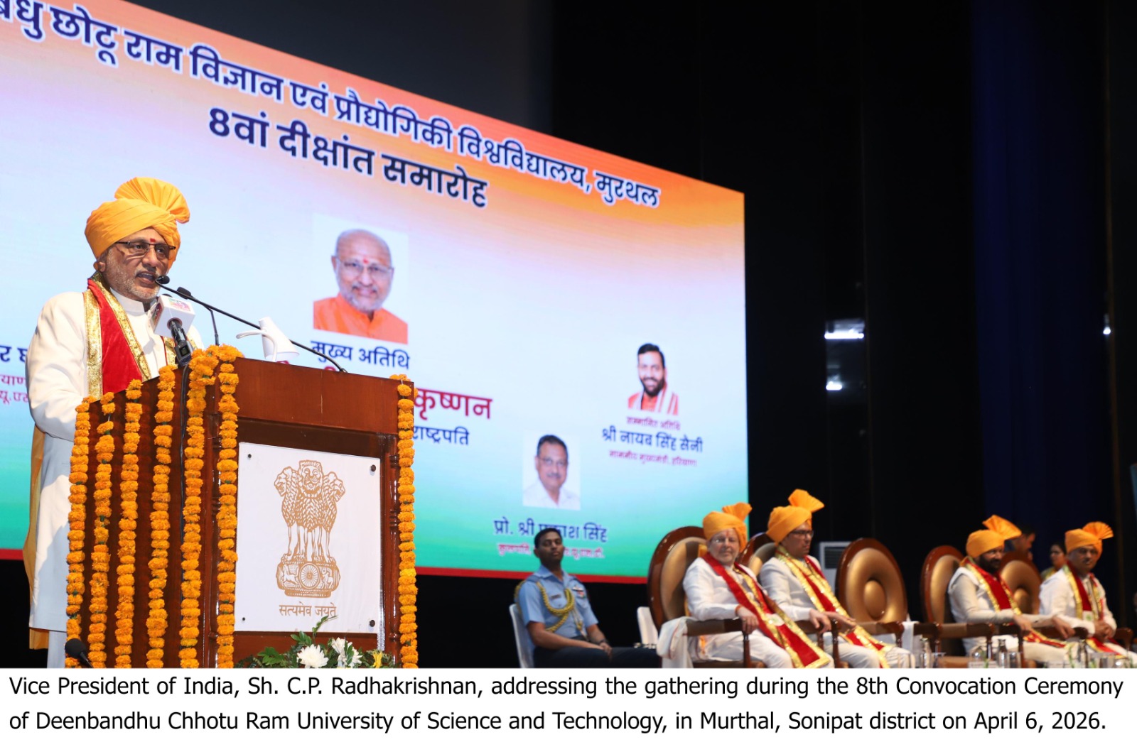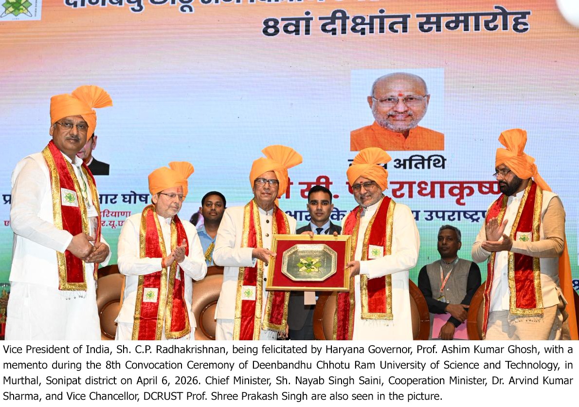 Sonipat, April 6 — Haryana Chief Minister Nayab Singh Saini said that today is a milestone in the history of Deenbandhu Chhotu Ram University of Science and Technology (DCRUST) and an unforgettable moment in the lives of students receiving their degrees. The Chief Minister welcomed and felicitated the Vice President of India,  C. P. Radhakrishnan, who attended the convocation ceremony as the Chief Guest. Haryana Governor and Chancellor Prof. Ashim Kumar Ghosh was also present on the occasion.