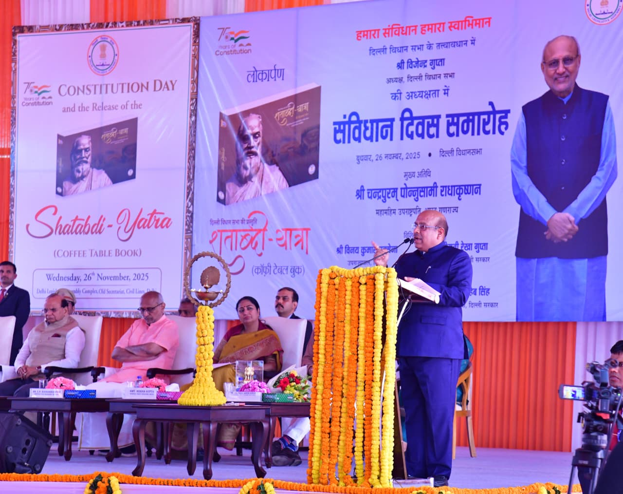 New Delhi, 26 November 2025 : “The capital of India, Delhi, should set the benchmark for excellence globally. It should not aspire to be like London, Washington, or any other city, but must shine as the best capital in the world” said Vice President of India C.P. Radhakrishnan on the occasion of the 75th anniversary of adoption of the Constitution and Unveiling of the specially curated Coffee Table Book, marking 100 years since Vithalbhai Patel became the first Indian elected Speaker of the Central Legislative Assembly on 24 August 1925. The Coffee Table Book was formally unveiled by the Vice President. The event was graced by Lt. Governor of Delhi Vinai Kumar Saxena and the Chief Minister of Delhi Smt. Rekha Gupta as Guests of Honour, The Deputy Speaker Mohan Singh Bisht, Delhi Cabinet Minister Parvesh Sahib Singh, Ravindra Indraj Singh and the Chief Secretary, Govt. of NCT of Delhi Rajeev Verma were present in the event. Former Governor of Assam Jagdish Mukhi, Member of Rajya Sabha Ms. Swati Maliwal, MLAs , Senior Leaders and Councillors were also present at the event. LG V K Saxena administered the pledge to the people on the occasion of Constitution Day and as a part of the National observance, a three-minute short film prepared by the Government of India on the occasion of the 75th anniversary of the Constitution was also screened.