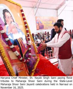 Narnaul, November 16 – Haryana Chief Minister Nayab Singh Saini today announced several developmental projects for Mahendragarh district. At the state-level ceremony organized on Sunday in the New Grain Market, Narnaul on the occasion of Maharaja Shoor Saini Jayanti, the Chief Minister inaugurated and laid foundation stones for various development projects worth approximately Rs. 83.70 crore for the district.