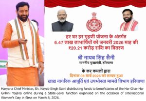 He said that the ‘Lakhpati Didi Yojana’, announced by the Prime Minister on Independence Day 2023, aims to ensure economic independence for women. In Haryana, 1.06 lakh women have already become Lakhpati Didis, and during the financial year 2026–27, another 3 lakh women will be made Lakhpati Didis.