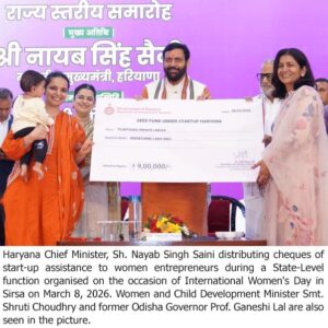 He described the launch of the Haryana chapter of ‘Mahila Udyamita Manch’ as another major step toward women’s empowerment. He said that the platform would help increase the number of women-led startups by 61 percent. On the occasion, assistance cheques were distributed to 16 women entrepreneurs, and ₹3 crore has been approved for women entrepreneurs. He said the platform would be a blessing for women wishing to start their own businesses.
