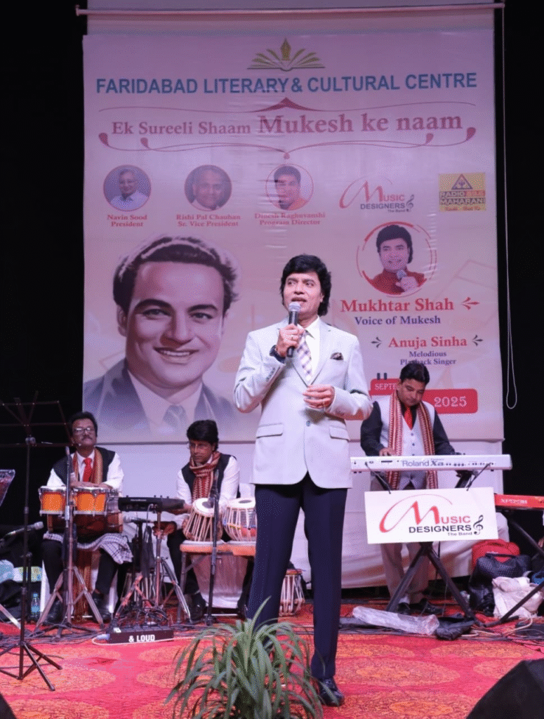 Faridabad, Sept 28 (Navin Dhamija): Faridabad Literary and Cultural Centre (FLCC) hosted a memorable music program Ek Surili Shaam Mukesh Ke Naam at Jiva Public School, celebrating the evergreen songs of legendary singer Mukesh. Renowned vocalist Mukhtar Shah, hailed as the “Golden Voice of Mukesh” and “Stage King,” captivated the packed auditorium with a stream of Mukesh classics.