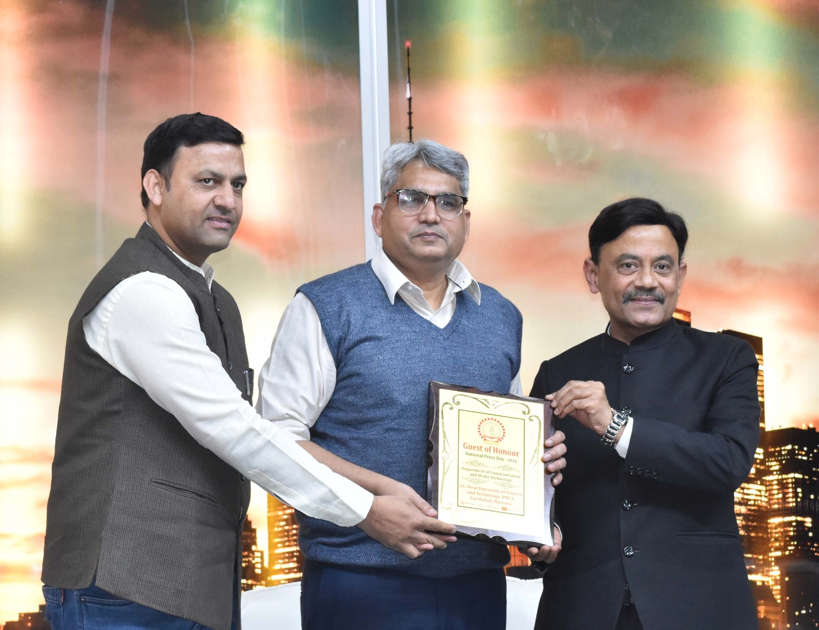 Faridabad. An event on the theme ‘Media in the Era of GENZ: Opportunities and Challenges’ was organized by the Department of Communication and Media Technology at J.C. Bose University on the occasion of National Press Day. The program included speeches, a poster making competition, and detailed discussions on journalism, featuring renowned journalists Amitabh Agnihotri, Consulting Editor and Senior Journalist at TV9 Bharatvarsh, and Anil Pandey, Director of India for Children. The winning participants were awarded trophies.