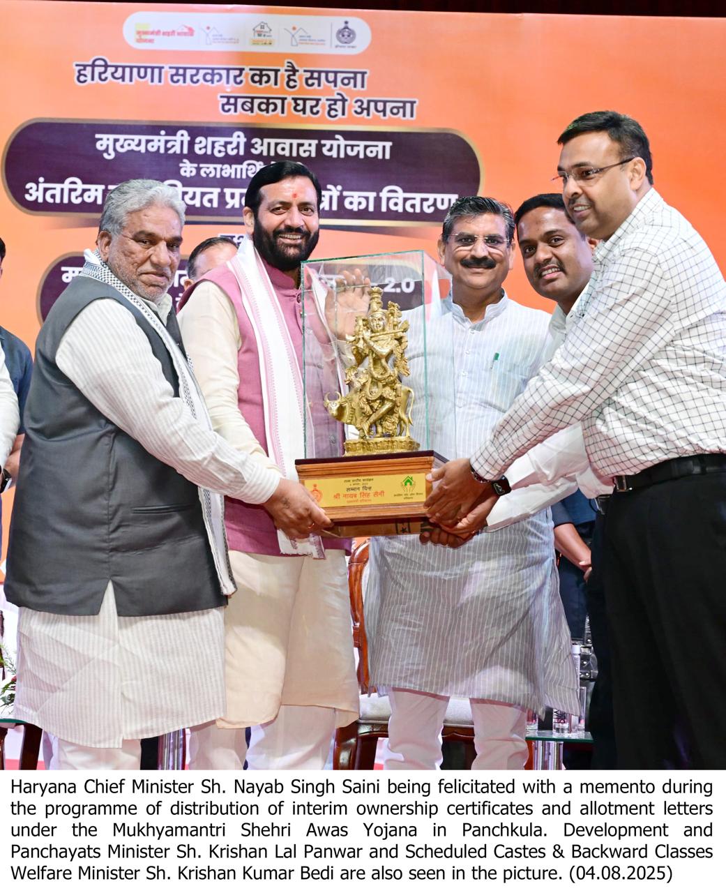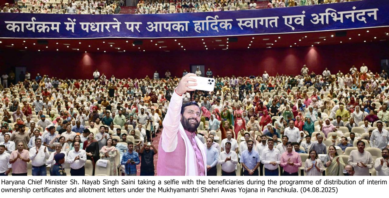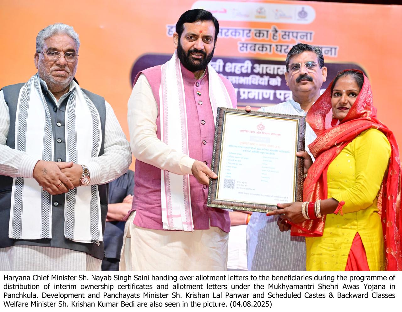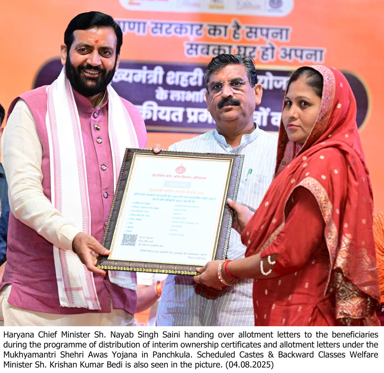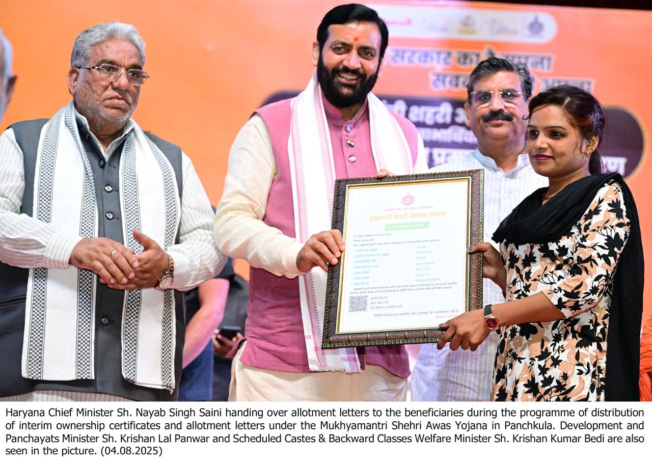 New Delhi, August 4 — In a major step towards housing for all, Haryana Chief Minister,Nayab Singh Saini on Monday handed over ‘Interim’ ownership certificates under the Mukhyamantri Shehri Awas Yojana and plot allotment letters under the Mukhyamantri Gramin Awas Yojana 2.0 to thousands of beneficiaries at a state-level programme held in Panchkula.