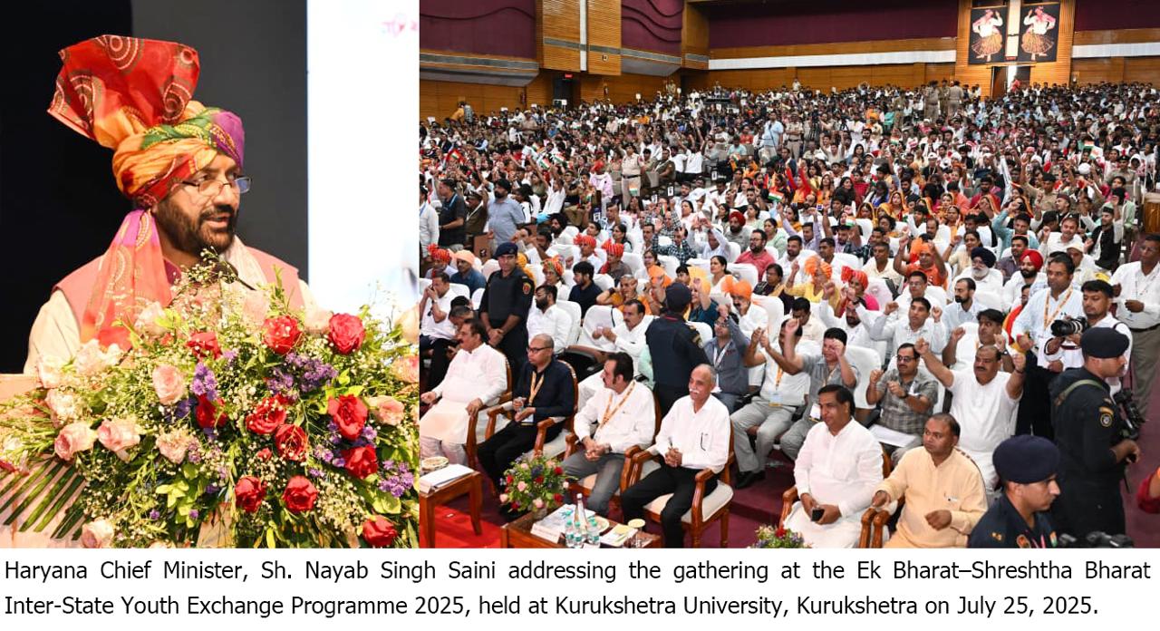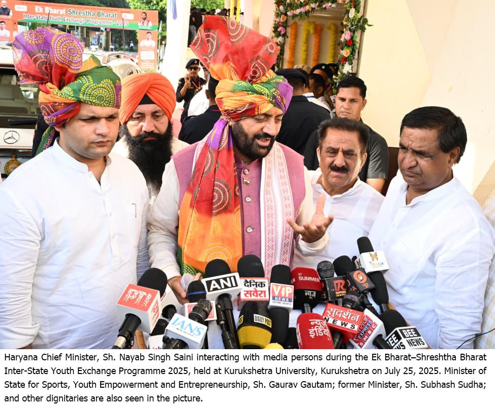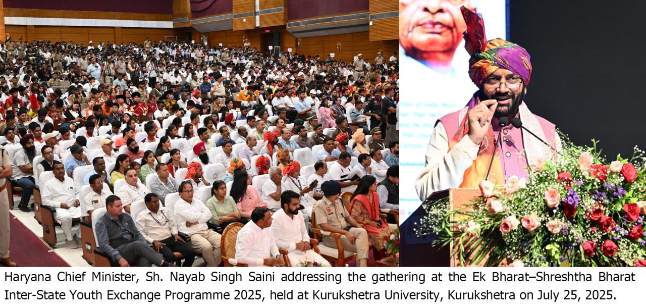 Chief Minister Nayab Singh Saini was speaking as a chief guest at the closing ceremony of ‘Ek Bharat Shreshtha Bharat Inter-state Youth Exchange Program-2025 in Kurukshetra today. Youth Empowerment and Entrepreneurship, and Sports Minister Gaurav Gautam was also present on this occasion.
