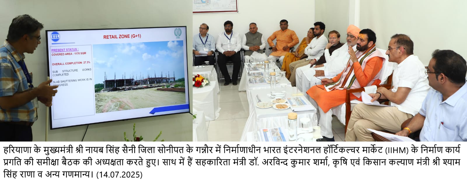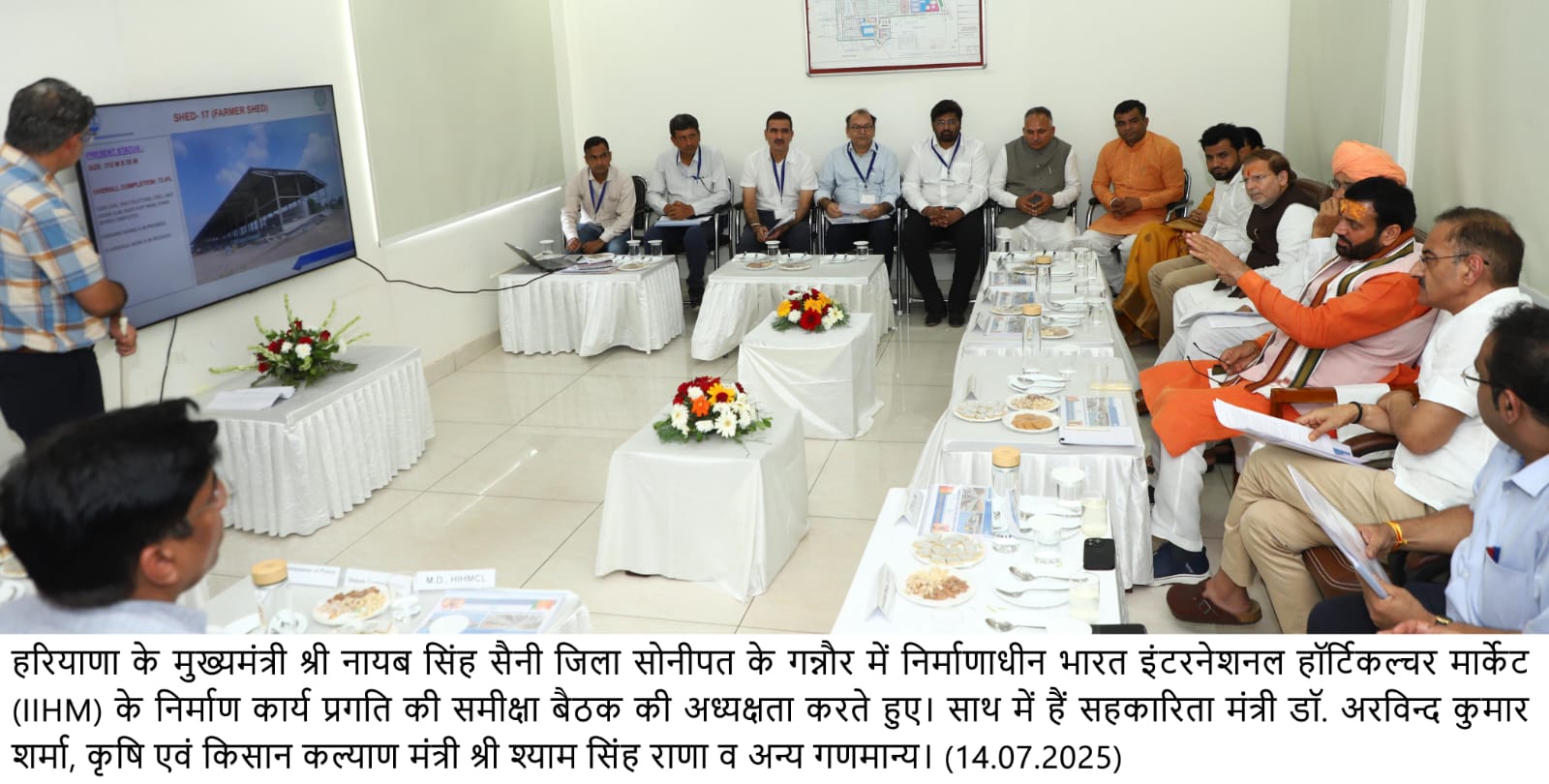 Sonipat, July 14 – Haryana Chief Minister Nayab Singh Saini on Monday visited the India International Horticulture Market (IIHM) at Ganaur in Sonipat district to review ongoing development and inspect the arrangements on-site. He held a review meeting with officials from the Marketing Board Administration, the construction company and the District Administration, directing them to expedite the construction work and ensure the project is completed within the stipulated timeline.