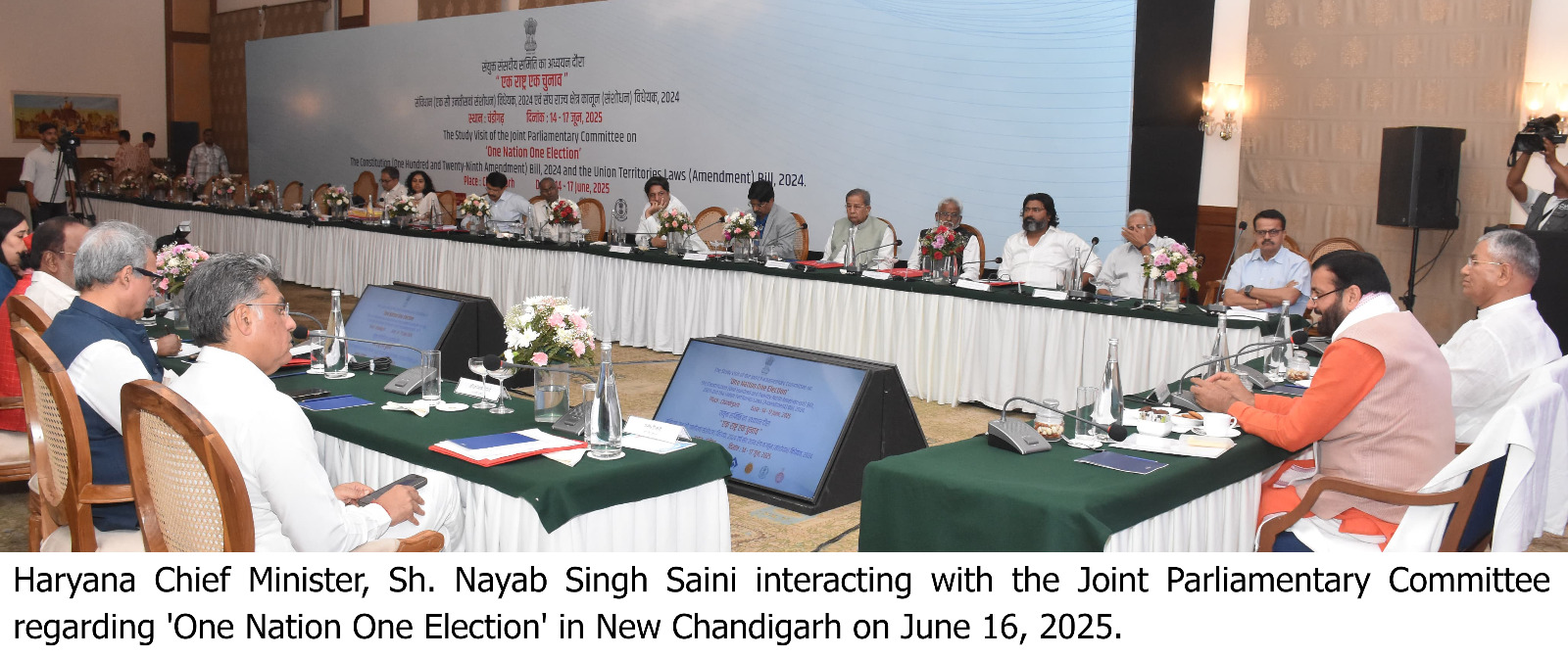 Chandigarh, June 16 – Haryana Chief Minister, Sh. Nayab Singh Saini said that ‘One Nation, One Election’ is a vital part of Prime Minister, Sh. Narendra Modi’s visionary concept of “Ek Bharat, Shreshtha Bharat”. It is not just a slogan but a national approach towards a strong and coordinated democracy. The Haryana government extends its in-principle support to this initiative, and its effective implementation will yield multi-dimensional benefits for the country, said Sh. Nayab Singh Saini.